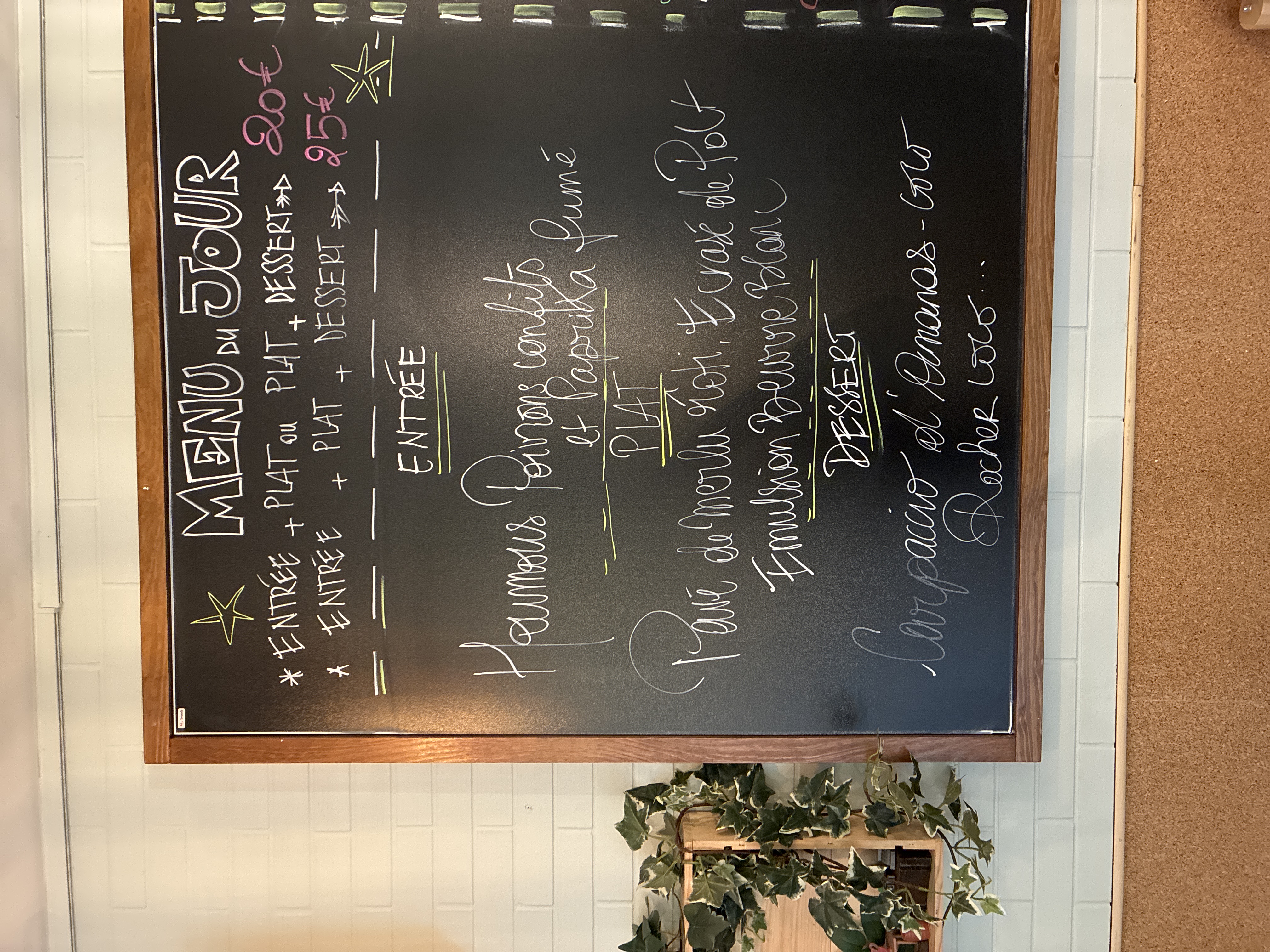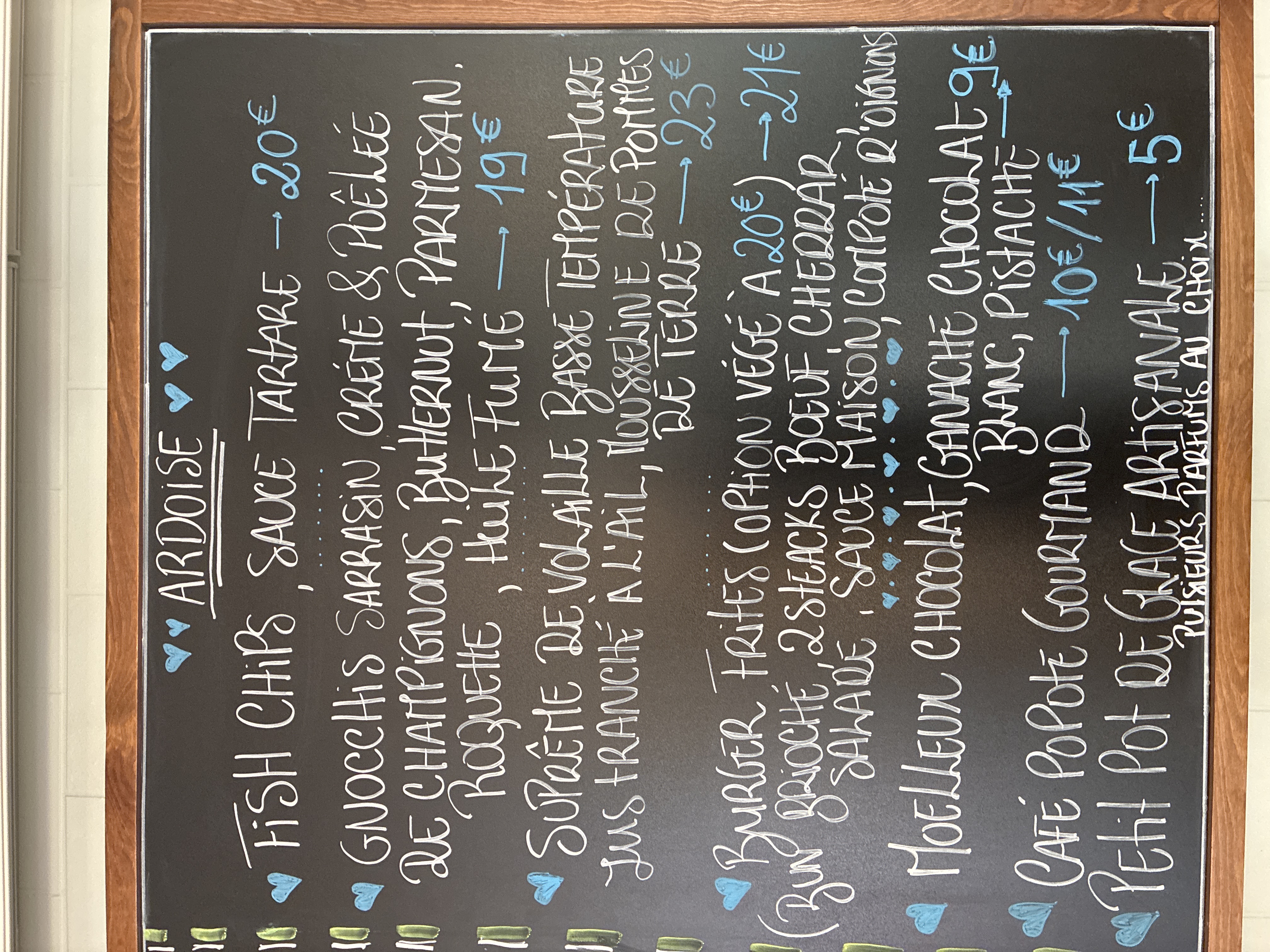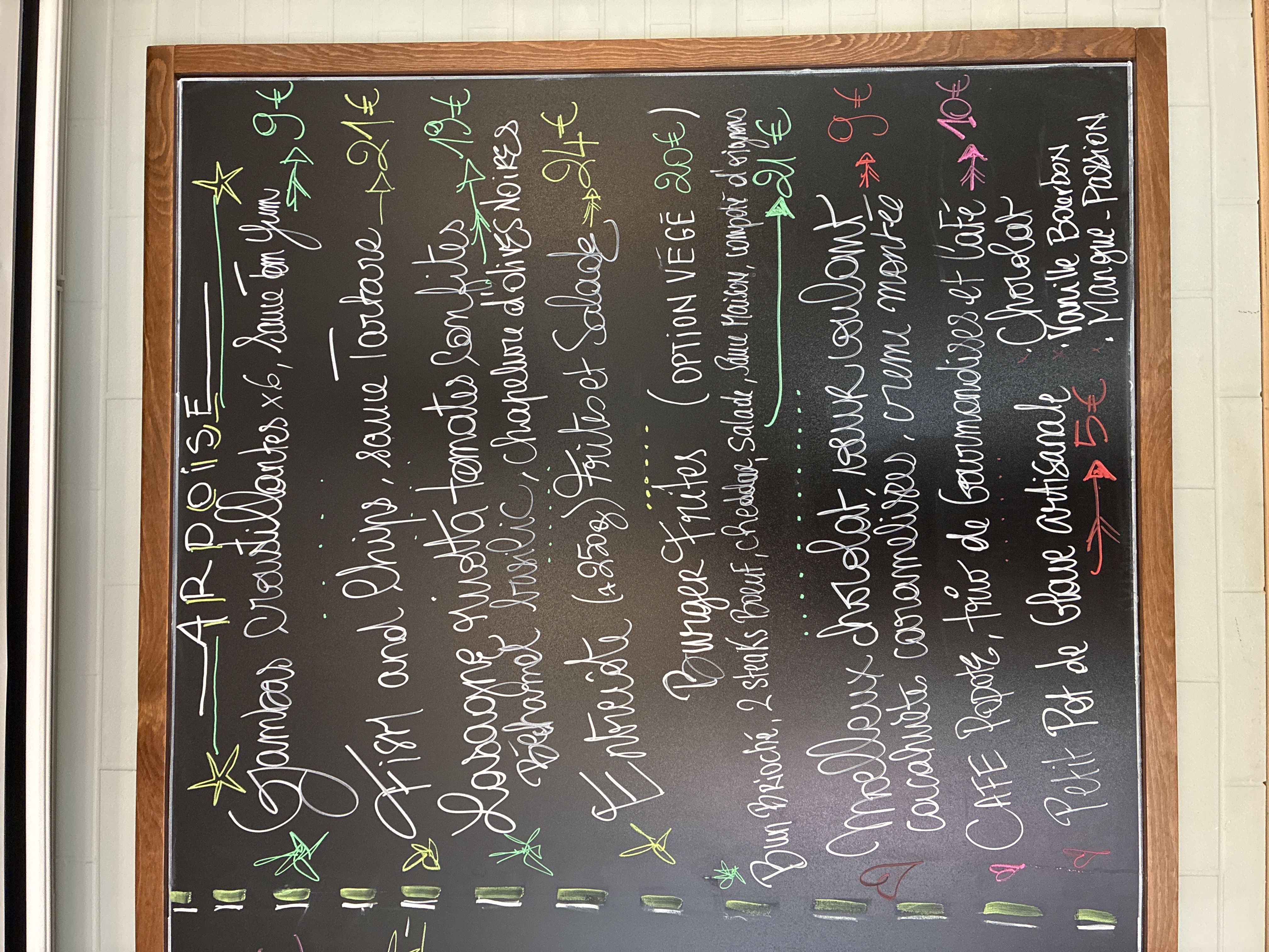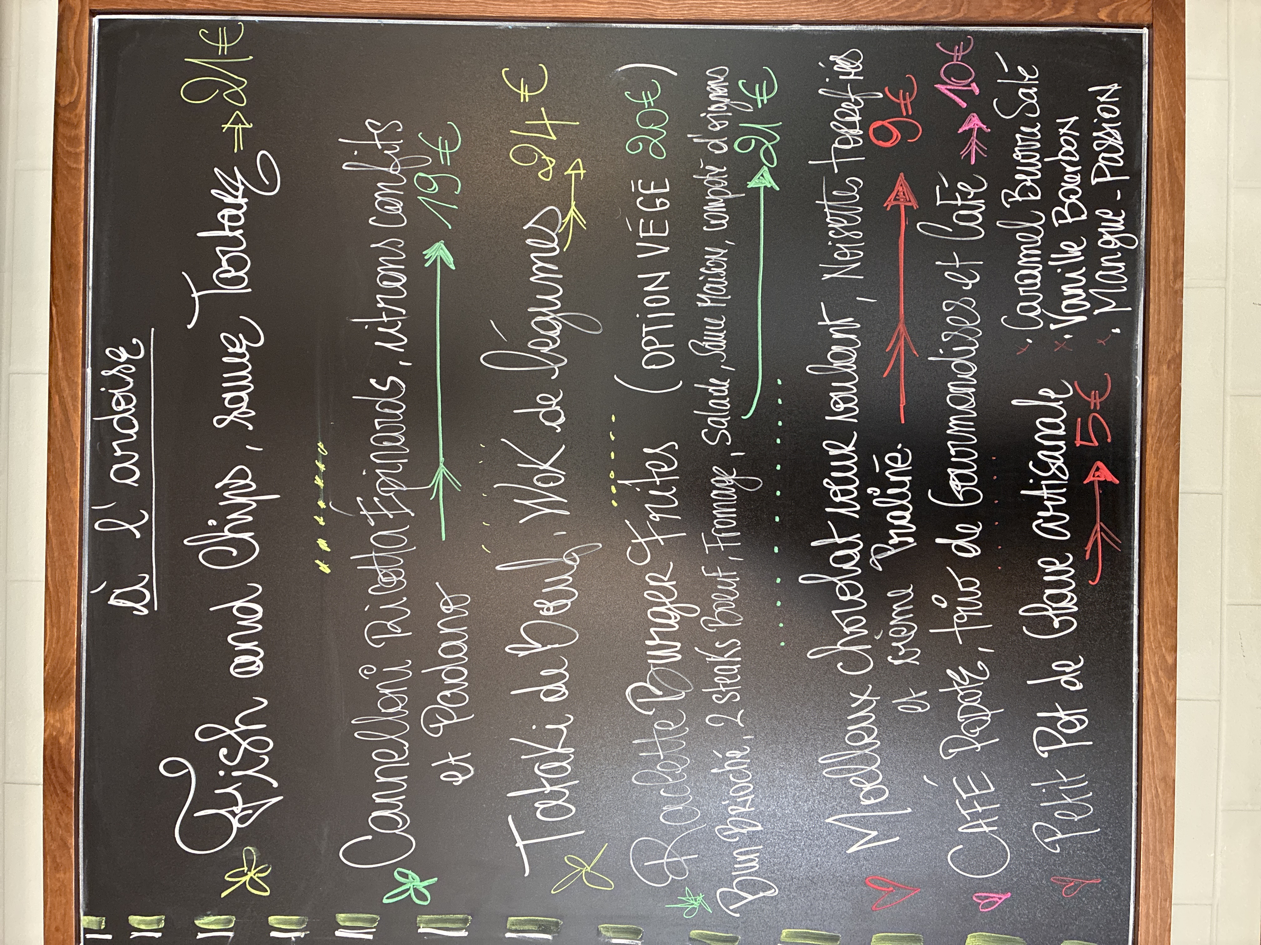 Nous proposons une ardoise courte qui change régulierement avec les produits du moment, en fonction de la pêche et des légumes de saison. Nous favorisons le local